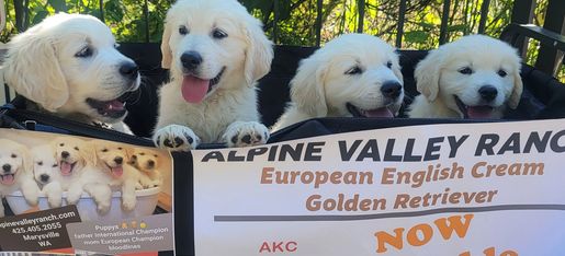 At Alpine Valley Ranch, our vision is to promote the health and well-being of European English Cream Golden Retrievers dogs through responsible breeding practices. We believe that every dog deserves a loving home, and we are committed to producing healthy and happy puppies that will make great pets for families and individuals alike.
